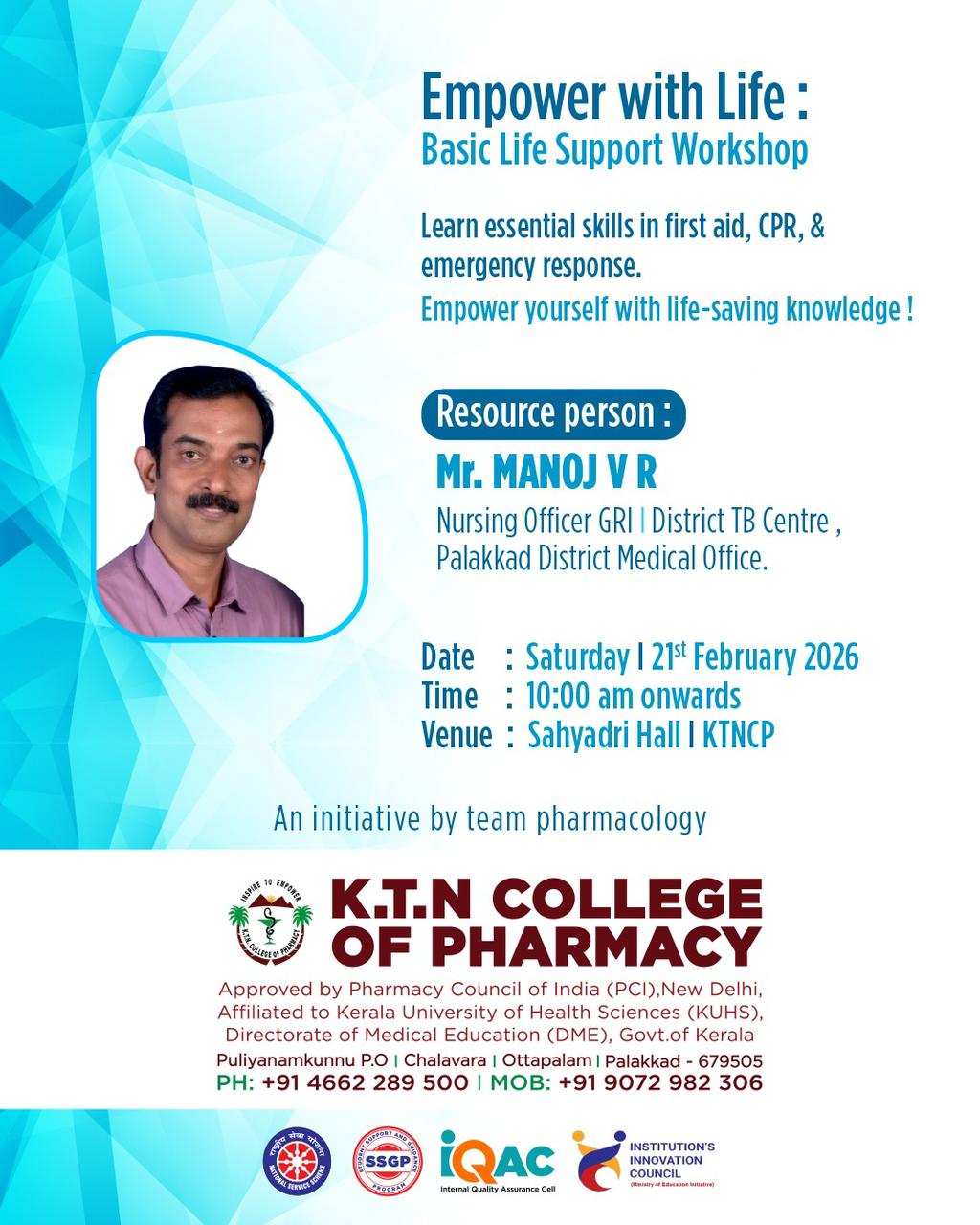 Basic Life Support Workshop was conducted to equip participants with essential first aid, CPR, and emergency response skills. Led by Mr. Manoj V R, Nursing Officer, District TB Centre, Palakkad, the session focused on practical, life-saving techniques to enhance preparedness in critical situations.