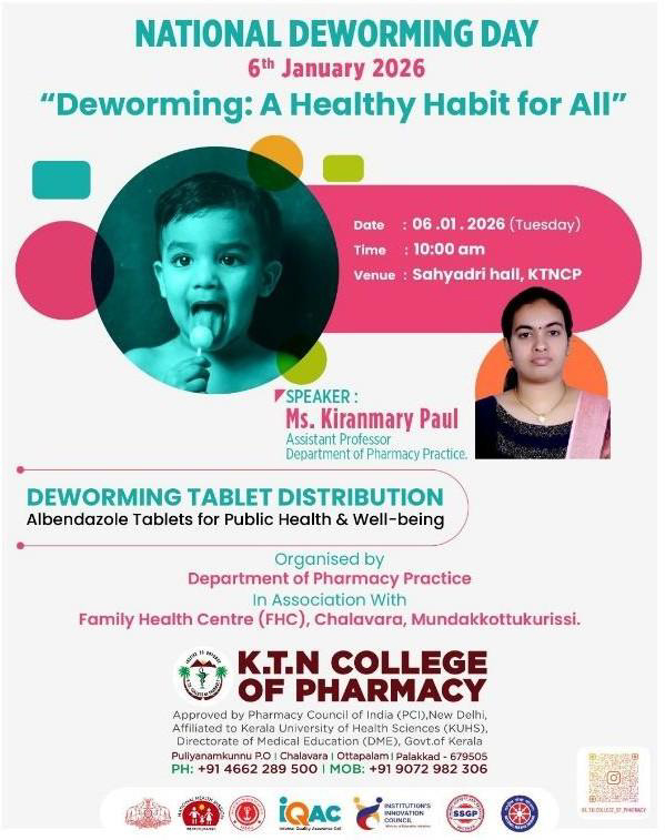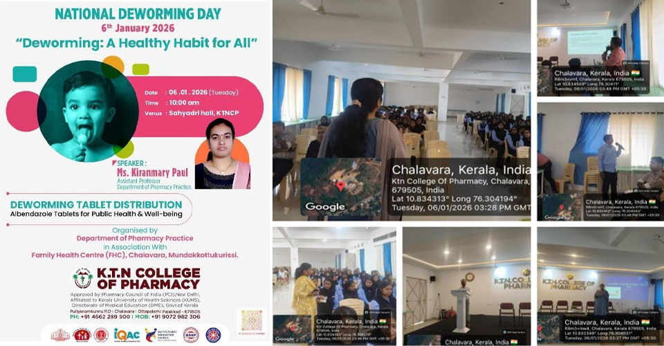 The Department of Pharmacy Practice at K. T. N College of Pharmacy organized a National Deworming Day Awareness Programme on 6th January 2026, in collaboration with the Family Health Centre (FHC), Chalavara, Mundakkottukurissi, under the theme “Dewormed children are healthy children.” The programme aimed to create awareness about helminthic infections, educate students on their prevention and management, promote National Deworming Day as per National Health Mission (NHM) guidelines, and ensure the safe administration of Albendazole tablets to eligible students. The event