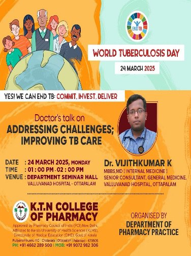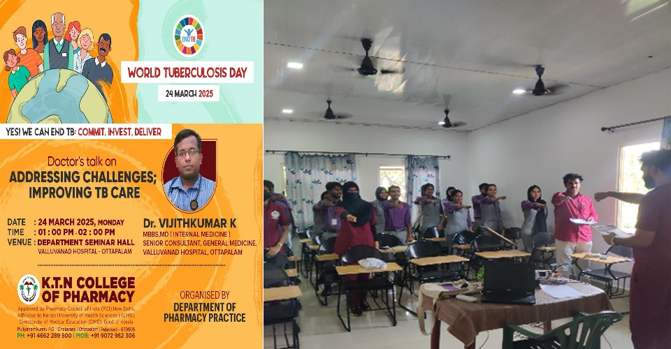 As part of the World Tuberculosis Day 2025 observance, The Department of Pharmacy Practice, K.T.N College of Pharmacy organized a specialized session on March 24, 2025, from 01:00 to 02:00 pm emphasizing the critical importance of early detection and management of Tuberculoisis. The session featured Dr. Vijithkumar K, senior consultant in general medicine from Valluvanad Hospital, Ottapalam, who shared his extensive expertise with an attentive audience comprising third-year and fifth-year Pharm D students, as well as interns. The session provided a comprehensive overview of TB, covering its epidemiology, pathophysiology, diagnosis, treatment protocols, and preventive strategies. The lecture also emphasized the global and national efforts to eradicate TB, in line with the initiatives set by the Government of India.